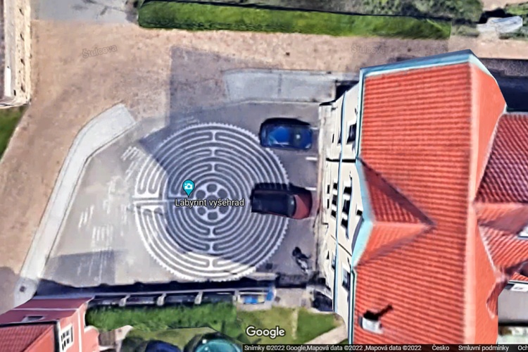 No a pokud byste se chtěli podívat na labyrint a neplánujete zrovna cestu do Chartres, tak jeho kopii najdete i v Praze na Vyšehradě na parkovišti za bývalou obřadní síní, jak dosvědčují Google mapy.