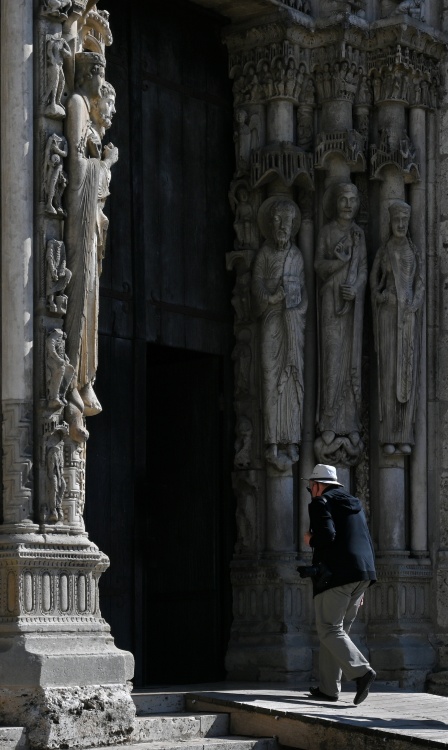 Jižní průčelí katedrály se sochařskou výzdobou. I když byly sochy zrestaurována, hlavy některých svatých, usekané revolucionáři po roce 1789, nebyly nahrazeny, jak je vidět na fotce vpravo.