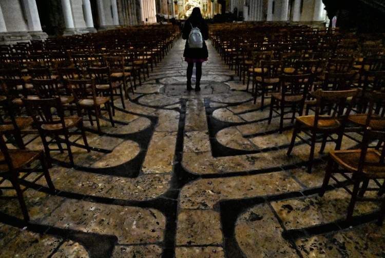 Na slavný labyrint, vytvořený ze dvou barev kamene na podlaze, jsem byla zvědavá nejvíc – a o to víc jsem byla zklamaná. Nejenže byl kompletně zastavěn židlemi, ale navíc kvůli tmě nebyl skoro vidět (proto také je ta fotka tak špatná).