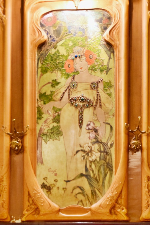 Další Muchův motiv, připomínající slavný návrh klenotnictví Fouquet, na kterém hrají hlavní roli pávi. Tady je najdete u vstupu na toaletu (a pro zajímavost i její starosvětský interiér s pultíkem pro madame správcovou).