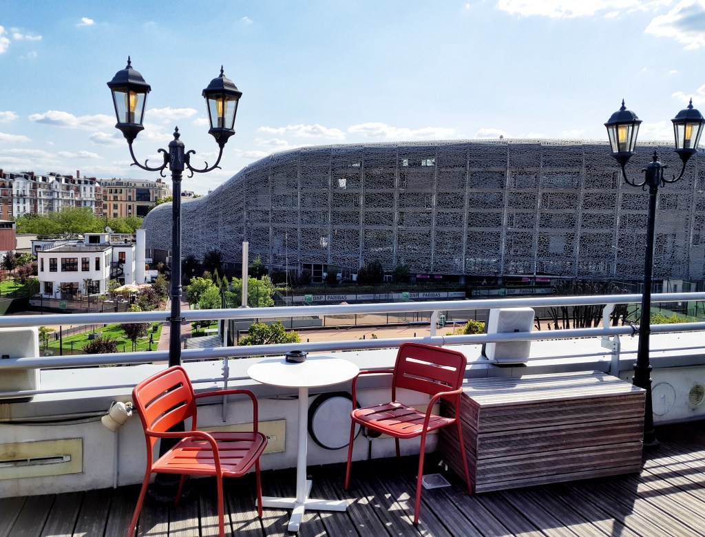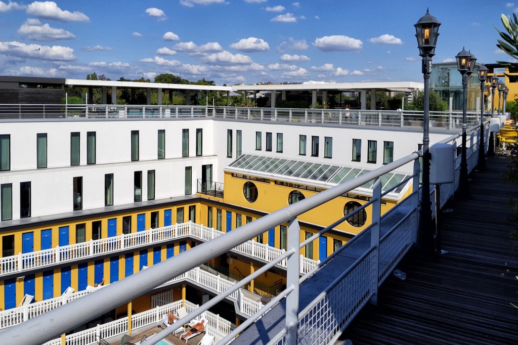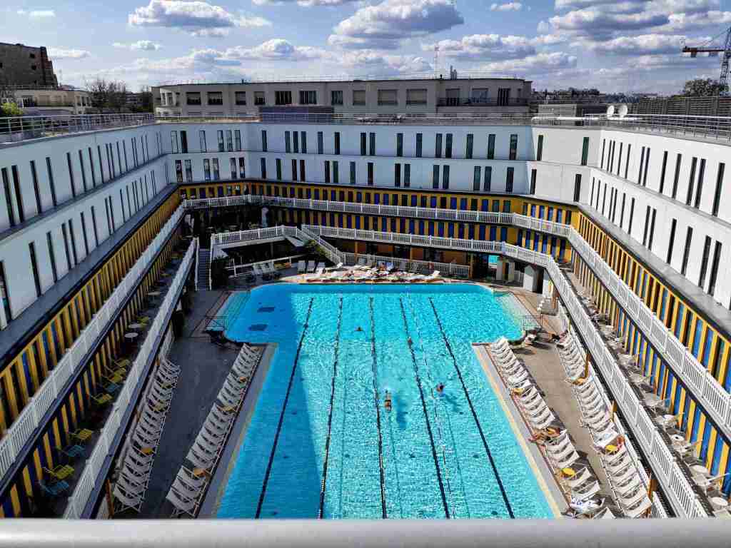 Kromě pohledů do vnitřních částí hotelu a hlavně na bazén jsou ze střešní terasy i nádherné výhledy do okolí. Toto je pohled na vedlejší stadion Jeana Bouina, jehož venkovní plášť je tvořen zvláštní kovovou krajkou. Za ním potom leží (ale odtud není vidět) slavný Parc des Princes, fotbalový stadión klubu Paris Saint Germain. V ulici vlevo za stadionem Jeana Bouina pak stojí dům, navržený architektem Le Corbusierem, s jeho osobním bytem.
