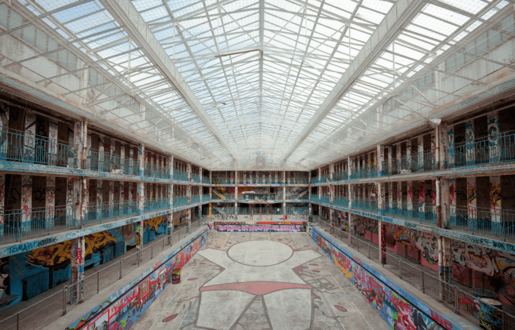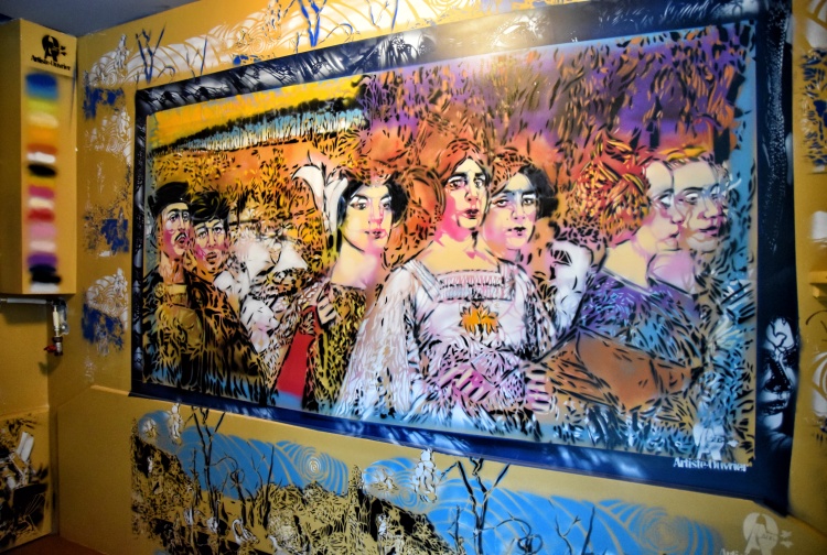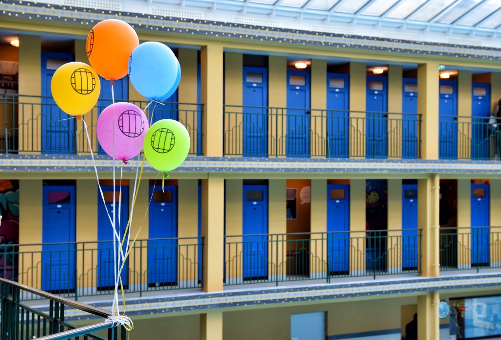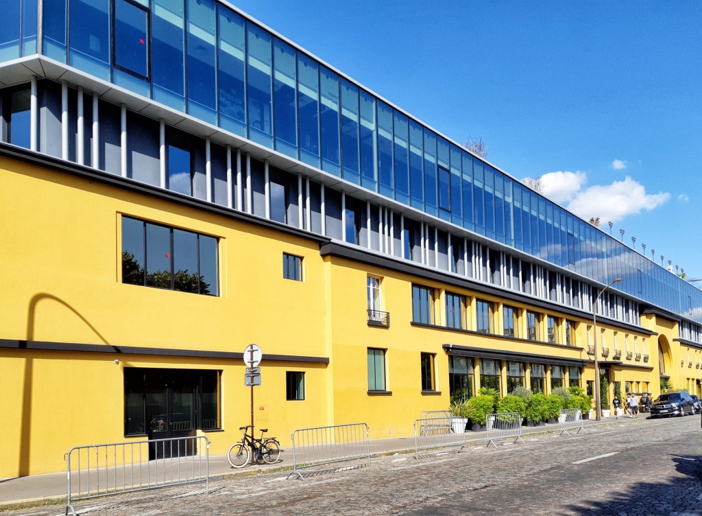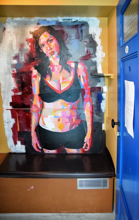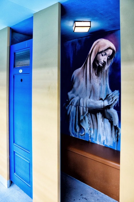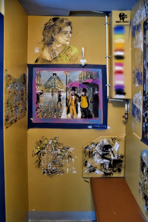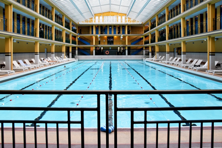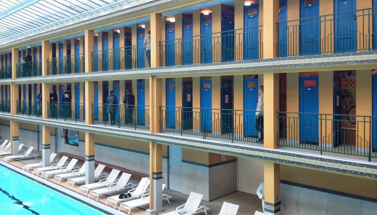 Krytý bazén věrně odráží původní podobu, a to nejen svým uspořádáním, ale i barvami žlutých konstrukcí a modrými dveřmi převlékacích kabin. Ty byly s odkazem na nedávnou squatterskou historii, kdy byl interiér plovárny pokryt graffiti, vyzdobeny nejznámějšími pařížskými streetartisty. Zatímco zvenčí vidíte jen hladké plochy dveří, uvnitř vybuchují ohňostroje barev.