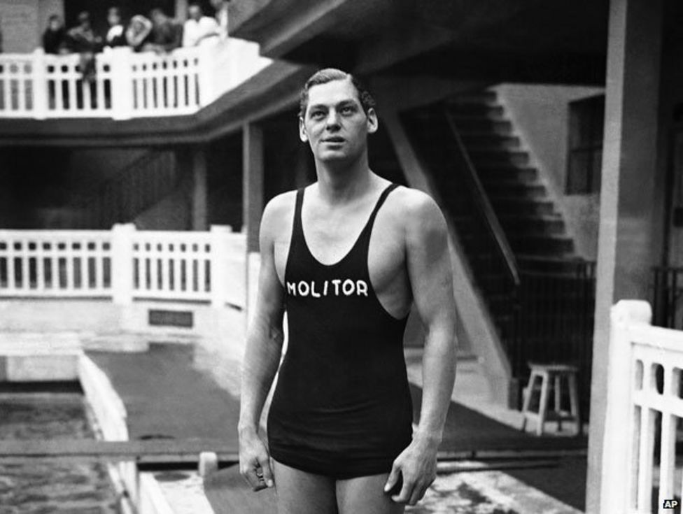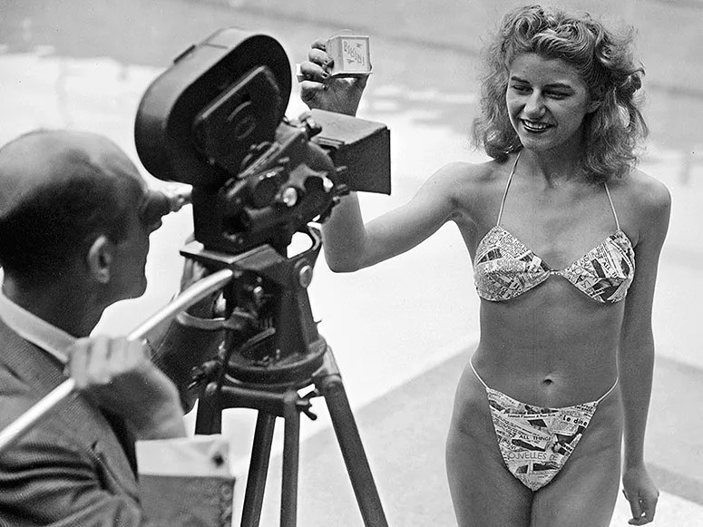 Vlevo Johnny Weissmüller u bazénu Molitor. Vpravo modelka Micheline Bernardini při prezentaci prvních dvoudílných plavek na světě právě u tohoto bazénu v roce 1946. Plavky dostaly název podle francouzského atolu Bikini. Foto bbc.com.