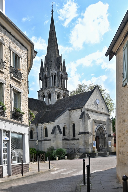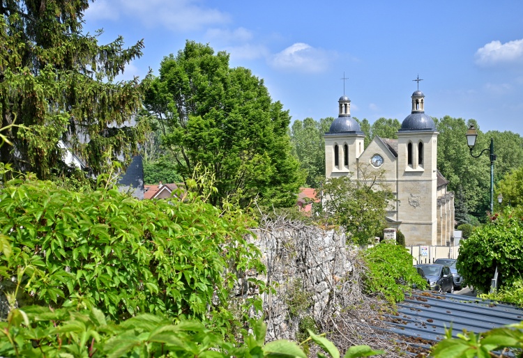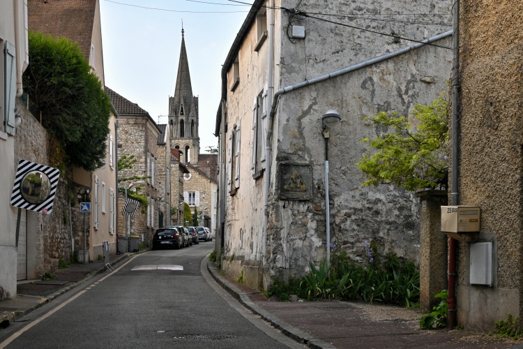 Když jsem se pak z Médanu chystala zpět do Paříže, hledala jsem jinou možnost, abych nemusela jít stejnou silnicí, po jaké jsem přišla. Nejdřív jsem myslela, že to půjde přímo podél řeky, ale podle mapy se zdá, že je cesta v krátkém úseku soukromá a tedy možná neprůchozí. Proto jsem se rozhodla, že se vydám na druhou stranu a do Paříže pojedu ze vzdálenějšího nádraží ve Verneuil sur Seine. Jsou to také dva kilometry, ale to už taková zábava nebyla, cesta moc pěkná není a městečko zkraje taky moc ne. Na své si přijdete až v jeho historickém jádru, kde najdete hezký kostelík a starodávné náměstíčko.