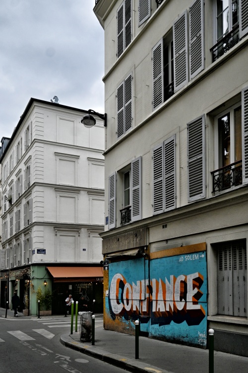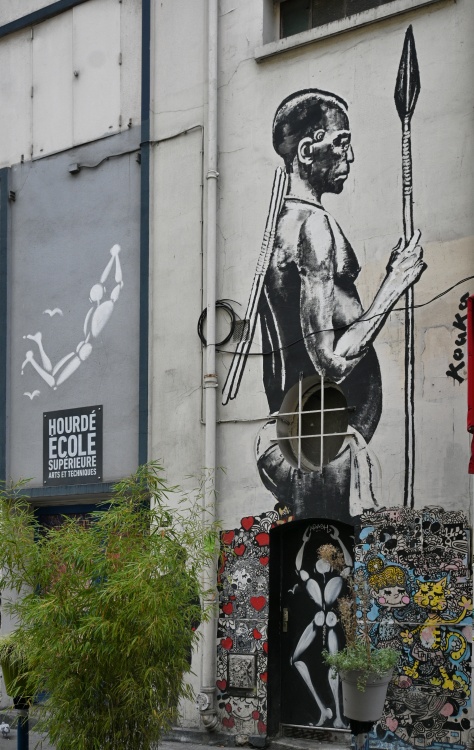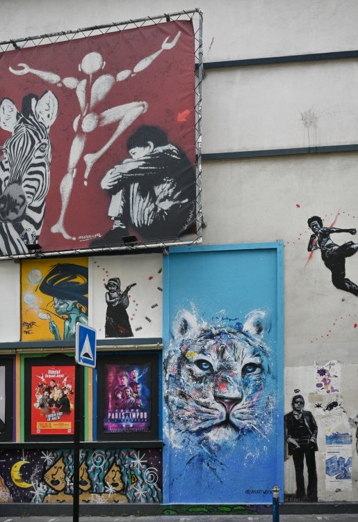 Po levé straně ulice hned na jejím kraji najdeme zeď divadla L´Européen a zároveň i umělecké školy Hourdé. Na zdi se svými díly podepsalo několik významných (a tím myslím opravdu dnes už slavných) street-artistů, těch z první generace, která začala působit už v 80. letech. Mezi nimi je tu zastoupen i Jef Aérosol, o jehož současné velké výstavě jsem psala zrovna nedávno.