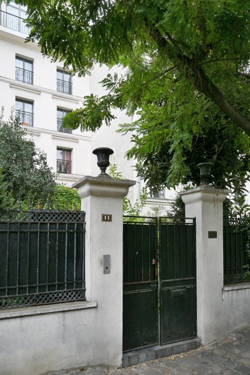 Ještě jednu pamětní desku vám ukážu. Tolik let jsem se na ni chystala podívat, ale udělala jsem to až nedávno. Nenajdete ji totiž přímo na ulici, ale v úzké, uzavřené a z ulice téměř neviditelné uličce Cité Lemercier, do které se vchází domem číslo 28 v rue Lemercier. Když se vám podaří překonat digikód v neprodyšně uzavřené bráně (nejlepší je počkat, až bude někdo vcházet nebo vycházet, mně to trvalo asi tři minuty), ocitnete se v tomto zelení zarostlém ráji.