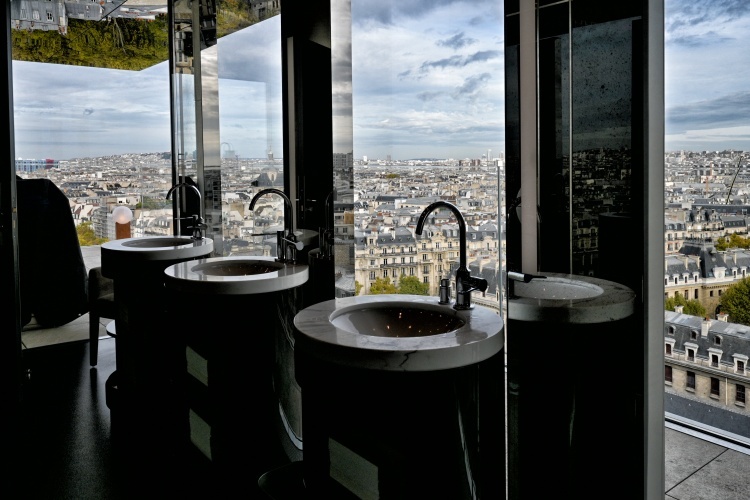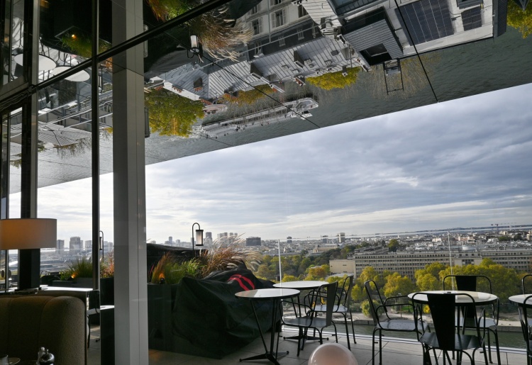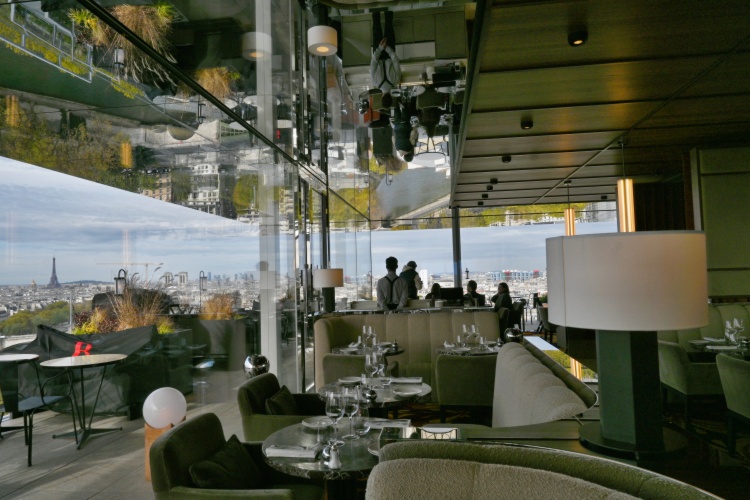Stejně ohromující jako výhledy je i celá restaurace – zabírá 15. a 16. patro, má kompletně prosklené stěny a je po celém obvodu lemována terasou s lehce nakloněnou nerezovou stříškou, díky které vidíte i to, co se děje na nábřeží a na Seině, která teče hned pod budovou.