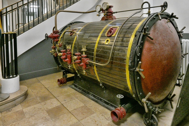 Z druhé strany průjezdu vede další schodiště do strohých kanceláří účtárny. Pod schodištěm najdeme zajímavý stroj – je to parní čistič, kterým se dezinfikovaly zastavené matrace před tím, než byly uloženy do depozitáře.