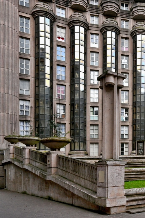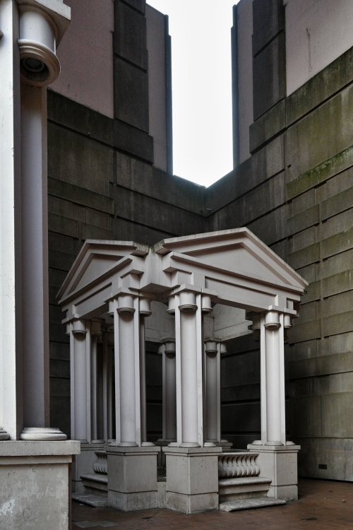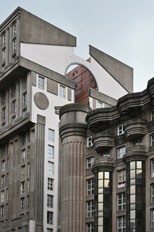 Plasticita betonu umožnila vytvoření různých textur a barev. Najdeme zde proto celou řadu prvků, vycházejících jak z antické, tak i z moderní architektury – pilastry, frontony, římsy, sloupy, ale také převisy, rampy, jednotná betonová zábradlí a dělicí panely. K odlití zhruba dvou tisíc různých fasádních prvků bylo použito čtyřicet speciálně vytvořených forem.