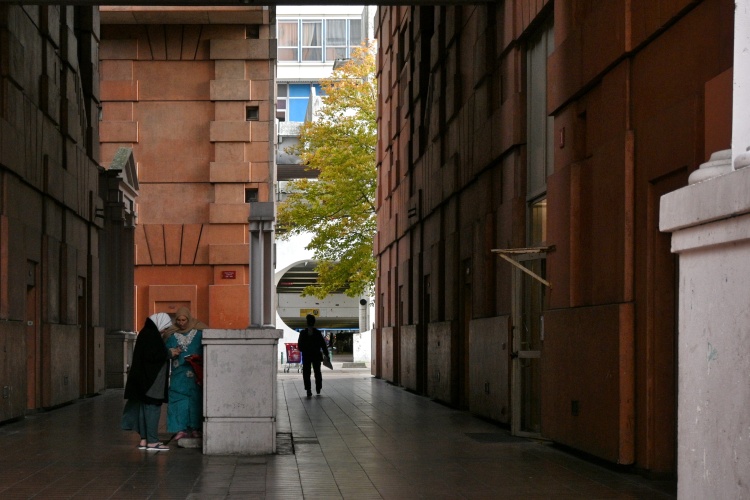 Na druhé straně vás zavede zase dolů, do ošklivé uličky, která komplex odděluje od nákupního centra. To je ta bílá stavba, kterou je vidět uprostřed v průzoru.