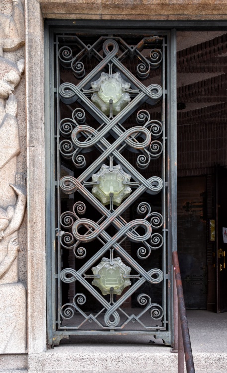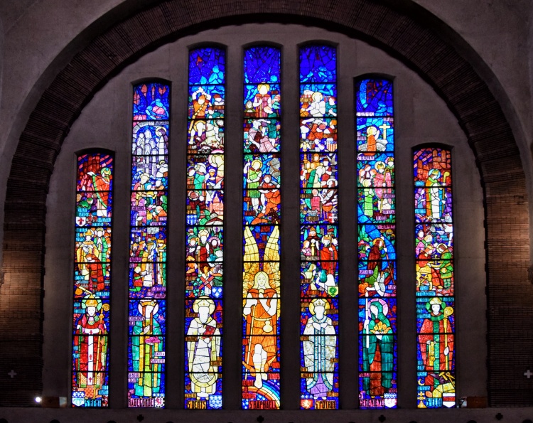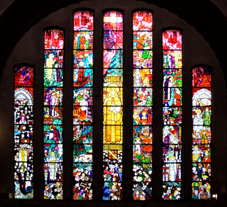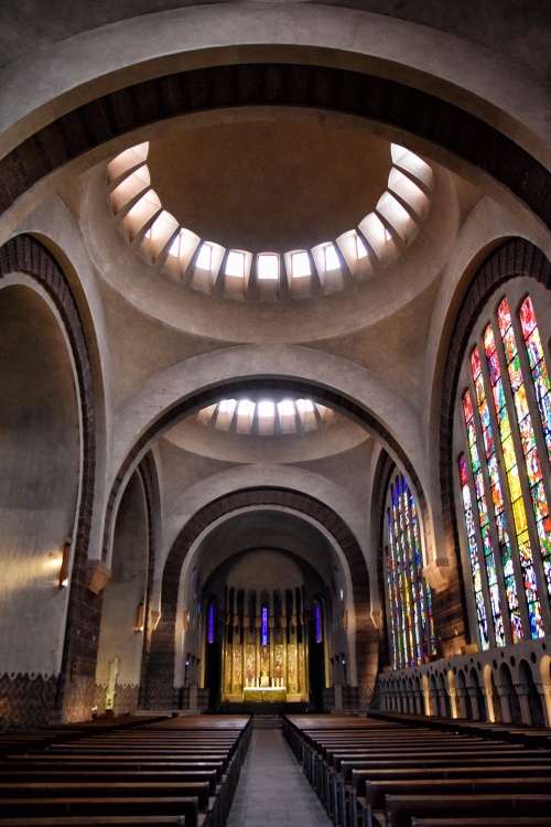 Pokud jste čekali, že interiér bude méně ponurý, tak… je to skoro ještě horší. V tmavě hnědé temnotě není výzdoba skoro vidět a kromě malých oken po obvodu všech tří kupolí, které propouštějí trochu světla, zde září jen tři pestrá vitrážová okna, která představují scény ze života svaté Odile, archanděla Michaela a archanděla Rafaela.
