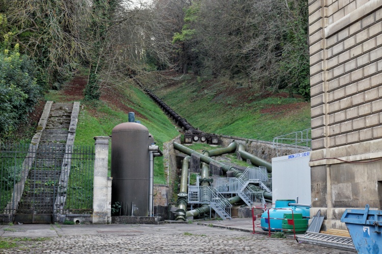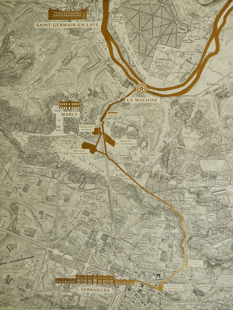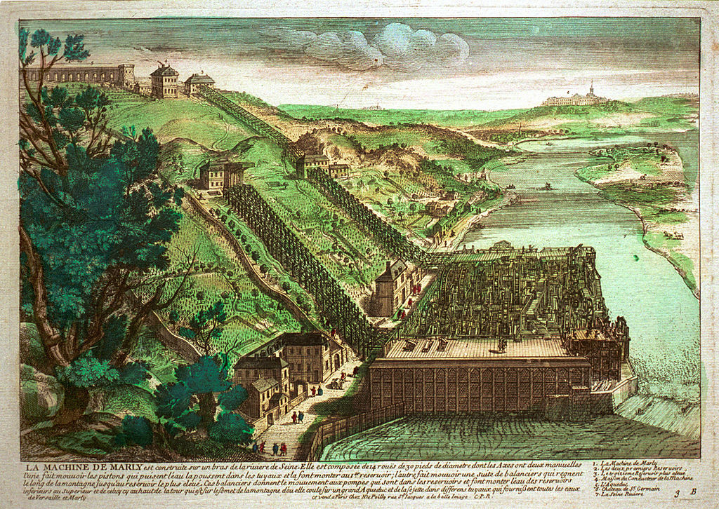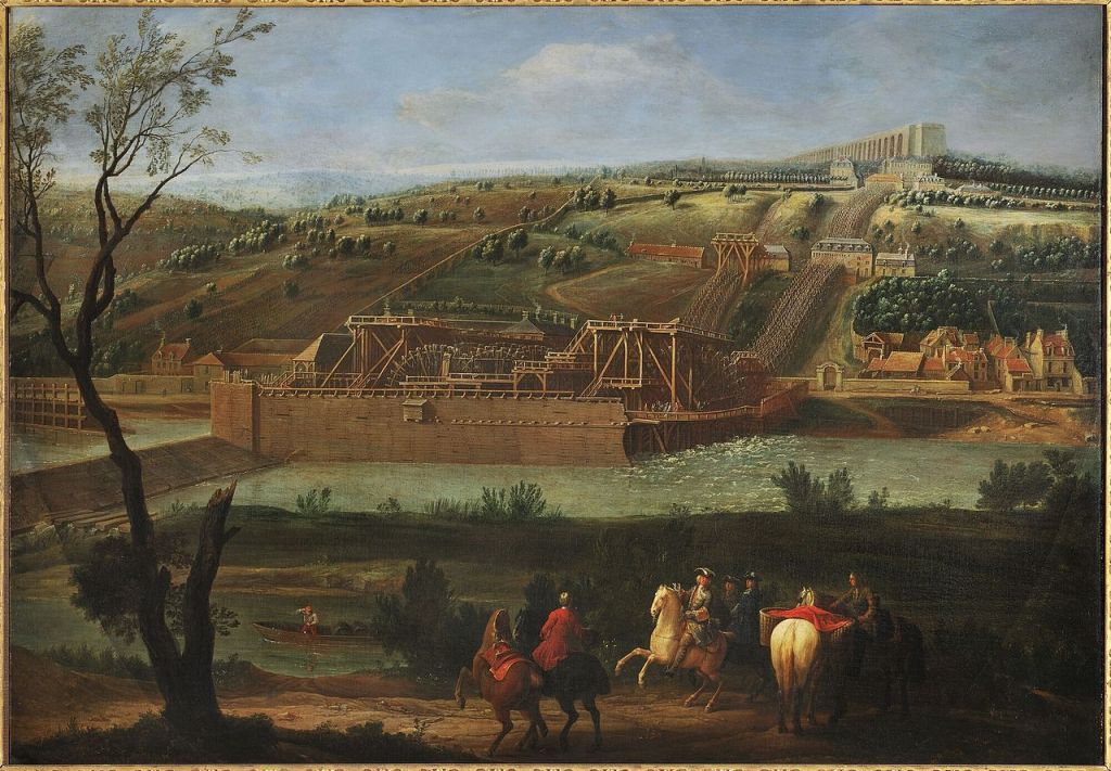 Po třech letech příprav byla v roce 1681 zahájena na břehu Seiny stavba gigantického čerpacího zařízení, která si vyžádala obrovskou částku, která by se dnes v přepočtu na eura dala vyčíslit na dvacet pět milionů. Řeka byla přitom rozdělena do dvou ramen: jedno z nich sloužilo pro vodní dopravu, zatímco to druhé zásobovalo čerpací stroj, složený ze čtrnácti vodních kol, každé o průměru deset metrů, která hnala vodu přes dvě stě padesát sacích a tlakových čerpadel sestavou potrubí nahoru do kopce s převýšením sto šedesát metrů, kde procházela dvěma čerpacími stanicemi, umístěnými na začátku a na konci akvaduktu v Louveciennes. Následně byla svedena do tří ohromných nádrží, odkud ji síť potrubí rozváděla na místa určení.