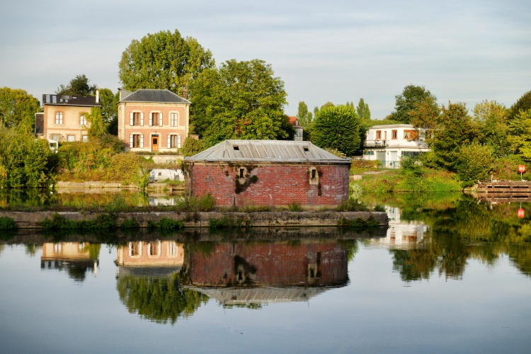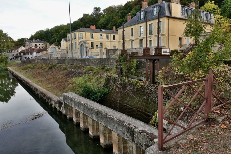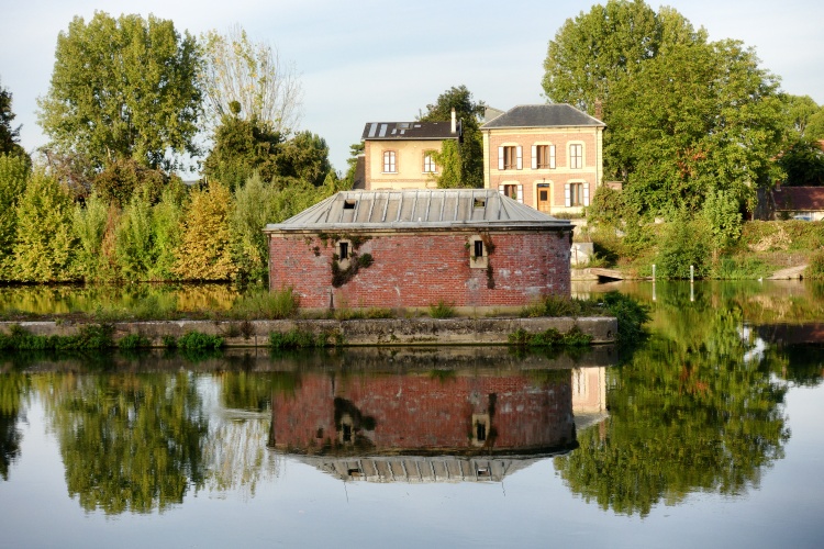 Dnes bych tady chtěla ukázat jednu z částí této oblasti, která je mou srdeční záležitostí. Mám zde popis trasy na polodenní, ale raději celodenní výlet, pokud to nechcete brát úprkem, jenže nejdřív musím začít od konce – u místa, kde tato procházka skončí a kterému se říká Machine de Marly. Narazili byste na něj snadno, pokud byste jeli po silnici z Paříže směrem k Saint-Germain-en-Laye. Silnice zde vede přes obec Bougival těsně vedle Seiny, nad kterou se tyčí kopec, na jehož vrcholku leží městečka Louveciennes a Marly-le-Roi. Ze silnice je vidět podivná okrouhlá stavba, stojící uprostřed řeky, která sice vypadá jako zapomenutý pilíř mostu, jenže jsou v ní okna a je zastřešená. Jde o jeden z posledních pozůstatků složitého čerpacího zařízení, vybudovaného v 17. století, jehož úkolem bylo vést vodu ze Seiny nahoru na kopec k zámku Marly a poté dál až do Versailles.