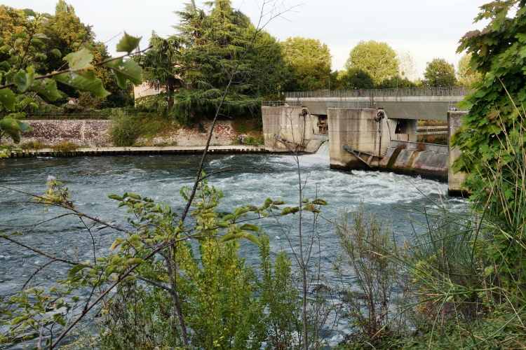 Mohutná kamenná základna, na kterém stávala kola původních čerpadel, zůstala u břehu řeky i nadále. Dnes zde tvoří malý bastion, na kterém je založen parčík, ze kterého je dobře vidět stavidlo těsně u břehu, kterým lze regulovat podzemní průtok vody k dnešním čerpadlům. Z tohoto bastionu pak můžeme vstoupit na most, který vede na ostrov Île de la Loge uprostřed řeky. Z bočního pohledu pak vidíme, že nejde o jen tak obyčejný most, ale o malou přehradu, která umožňuje zahradit tok tohoto ramene řeky a zvýšit tak objem čerpané vody.