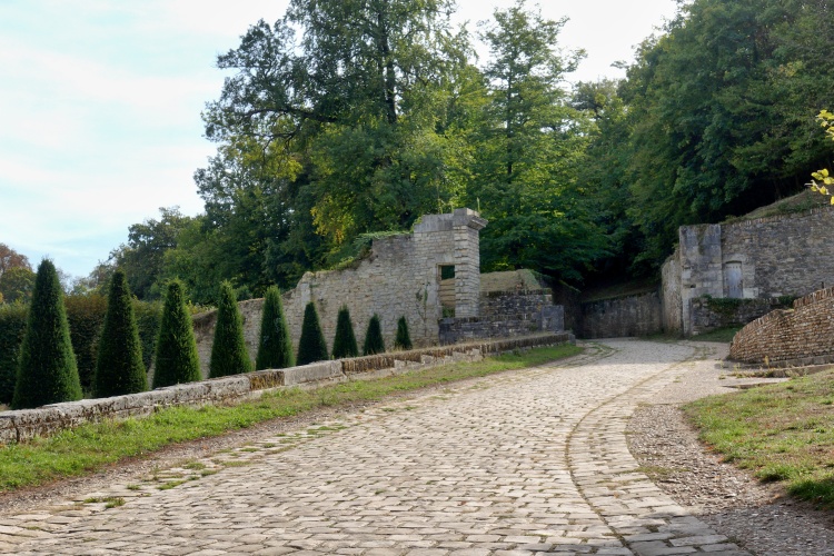 Na opěrné zdi, která celý prostor kolem bývalého zámku ukončuje západním směrem, jsou vystaveny kopie historických plánů zámeckého areálu. Vede odtud široká cesta, která bývala hlavním přístupem do zámku, kterým přijížděly kočáry. Zámek stojí pod svahem, proto je cesta zahloubená a poměrně prudce se svažuje. Stoupání nás přivede k hlavní bráně parku, přímo do prostoru, kde bývalo seřadiště královského vojska.