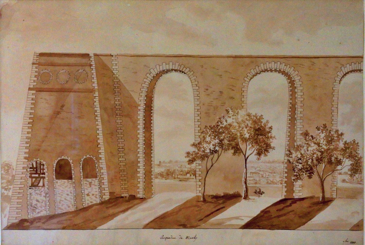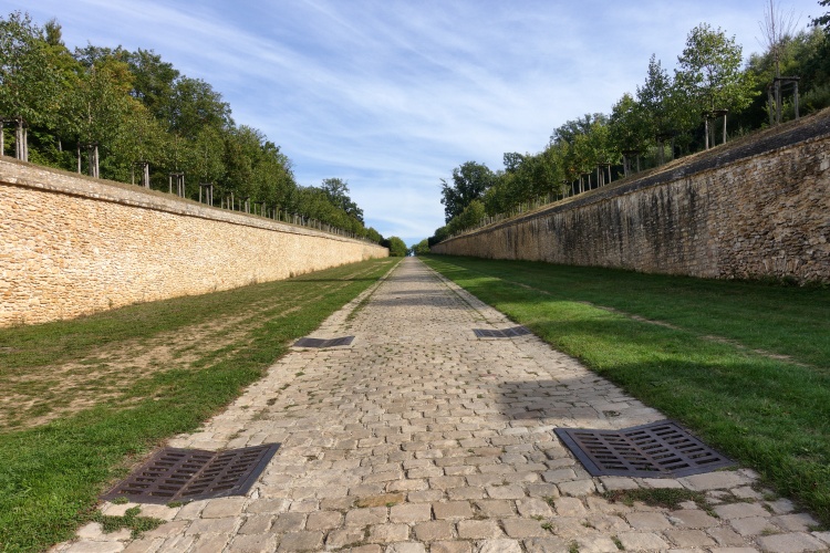 Ještě než celý areál opustíme, zastavíme se těsně před branou u nízkého domku s trojúhelníkovým štítem. Ten dříve sloužil pro potřeby akvaduktu, který sem přiváděl vodu z údolí za pomoci Machine de Marly, o které jsem psala minule. Právě tady, kousek od brány zámku, akvadukt končil. O něco výš nad branou ležely tři vodní rezervoáry, do kterých byla přiváděna voda z akvaduktu. Jeden z nich byste našli dodnes v areálu parku sotva pár minut chůze z tohoto místa, druhý je pak naproti za silnicí (dostat se až k nim ale nedá, jsou funkční a proto dobře chráněné). Třetí nádrž ležela trochu stranou směrem k Versailles, poblíž vojenské pevnosti z konce 19. století s děsivým názvem Pekelná díra, a dnes je zasypaná.