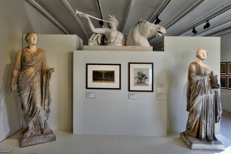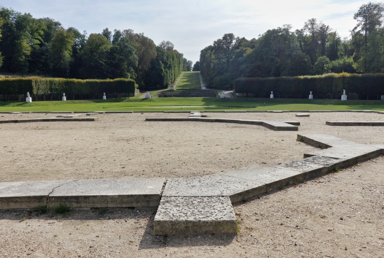 Po chvilce chůze se pak dostaneme přímo doprostřed parku, do míst, kde stával zámek. Celá plocha je osázena kopiemi soch, které v parku a v jeho vodních nádržích stávaly. Obrysy bývalého zámku jsou na zemi vyznačené zvýšenými obrubníky.