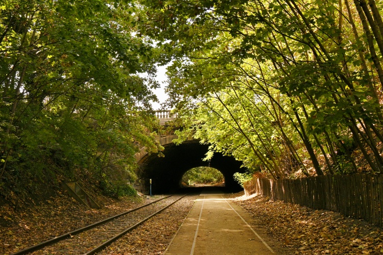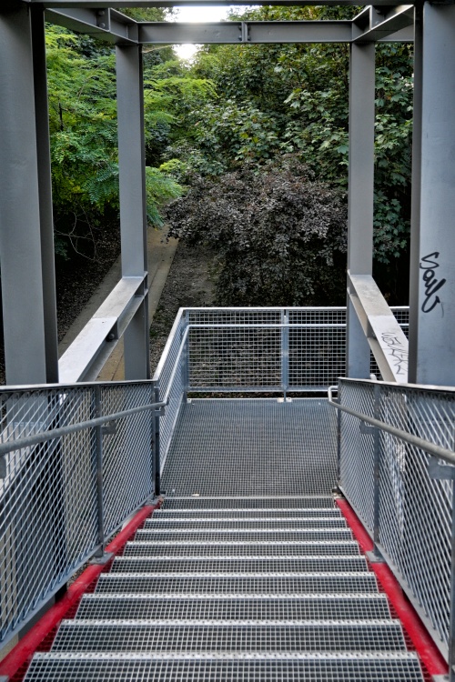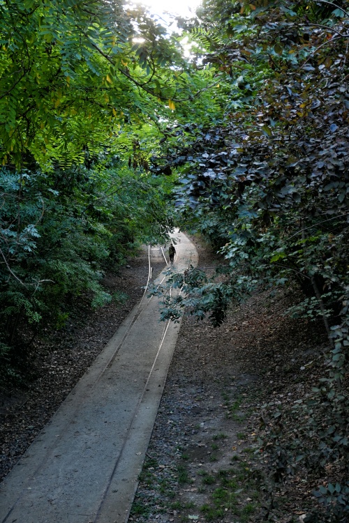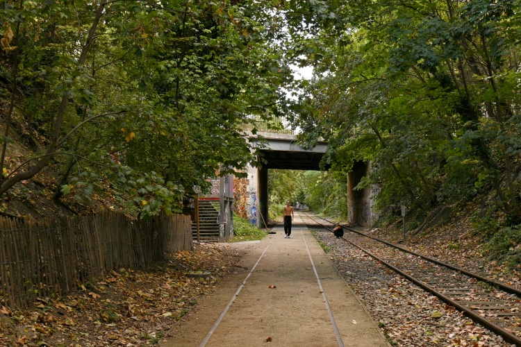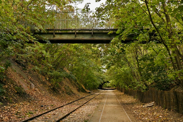Dnešní procházka začne právě na začátku tohoto divočejšího úseku trati poblíž Pont Cardinet, v místech, kde jsem na trať nakukovala už v rámci Velké procházky v 17. obvodu, a kde vede do příkopu vstup po kovovém schodišti. Příkopem pak můžete jít zhruba asi sedm set metrů po přírodní stezce, vybudované vedle bývalého kolejiště, jehož jedna část zde byla zachována. Během toho podejdete tři menší mosty a dlouhý tunel, který vede pod place de Wagram.