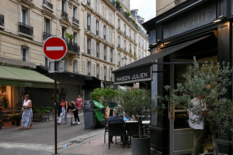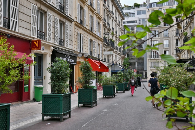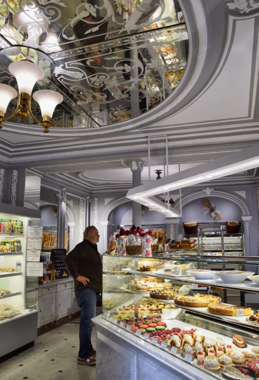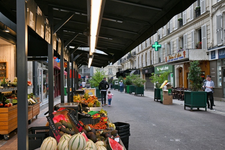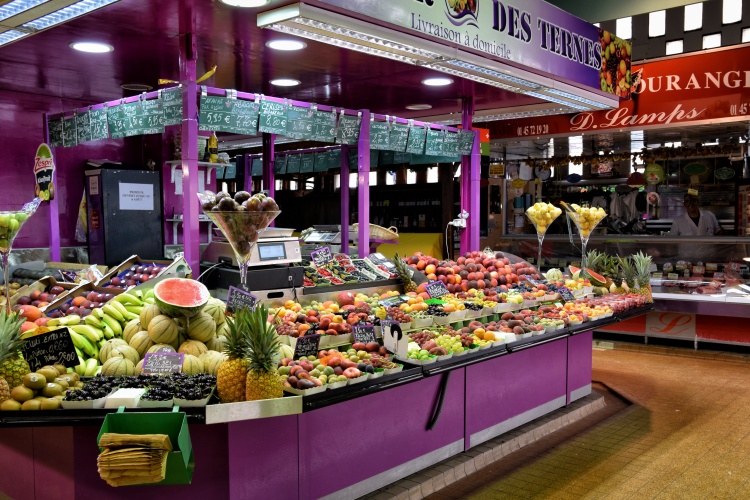 Zelený pás je samozřejmě na každé křižovatce přerušen, aby hned za přechodem pokračoval dál. Na jedné z těchto křižovatek na chvíli odbočíme a vydáme se po rue Lebon do hloubi čtvrti Ternes, kde se po pár desítkách metrů dostaneme k místní tržnici. Faktem je, že budova Marché des Ternes je jednou z nejošklivějších, kterou jsem v Paříži viděla, ovšem jen zvenčí. Uvnitř je plná úhledných stánků, které přetékají potravinami, často velmi luxusními. Obchodní ruch pak pokračuje i venku v rue Lebon, která se ve své druhé polovině mění na ryze obchodní pěší ulici se stánky a obchody, sahajícími vyloženým zbožím až na chodník. Na rohu s rue Pierre Demours pak narazíme na krásnou pekárnu s ohromujícím zrcadlovým interiérem a s prostorem k posezení.