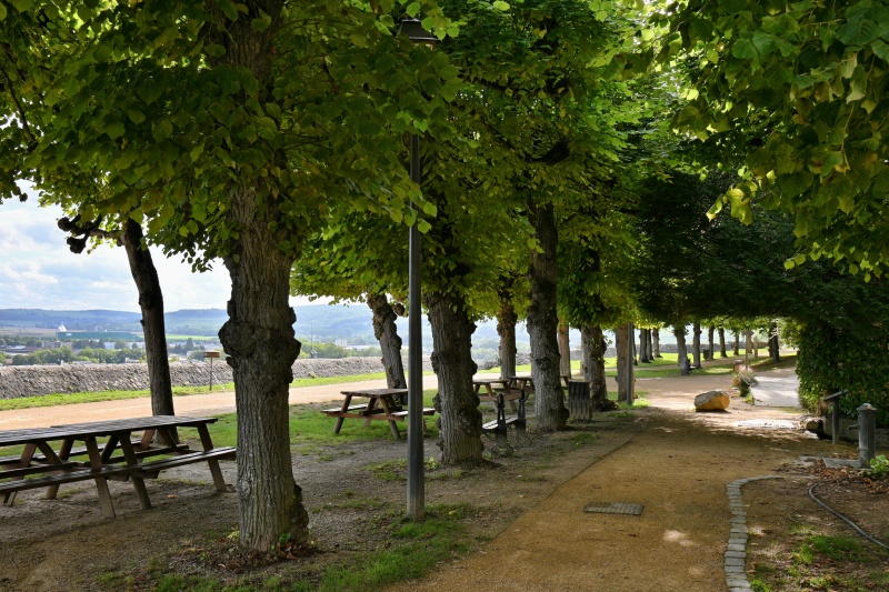 Cesta po vrcholku vás přivede až ke zřícenině jedné z hradebních věží. Tudy se dá sejít po schodišti dolů pod hradby. Vede podél nich cesta, která obkružuje celý areál. Přímo pod schodištěm pak najdete lavičky a také růžovou zahradu.