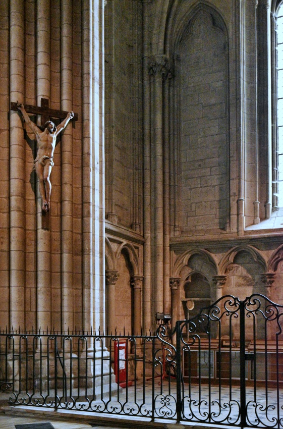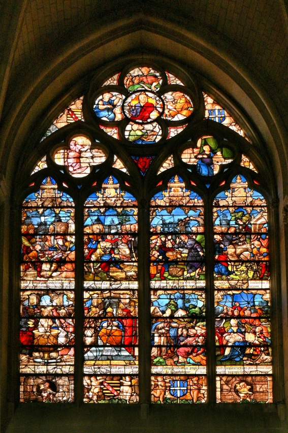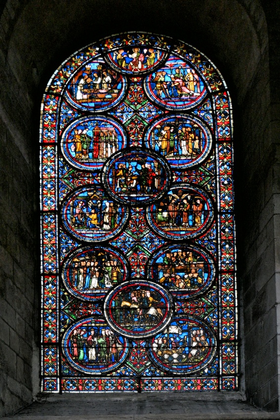 Vlevo jedna z růžic, pojednávající téma Nebeské hudby, s celou řadu andělů, hrajících na středověké hudební nástroje. Vpravo ještě komplikovanější téma, popisující konec života Thomase Becketa od jeho odchodu ze Sens až po jeho zavraždění horlivými barony anglického krále. Nejen tyto dvě, ale i všechny ostatní vitráže jsou úžasné, jen se na dálku a ve výšce prostým pohledem nedají obsáhnout a rozeznat všechny podrobnosti, natož je vyfotit tak, jak by si zasloužily. Příště si asi vezmu dalekohled.