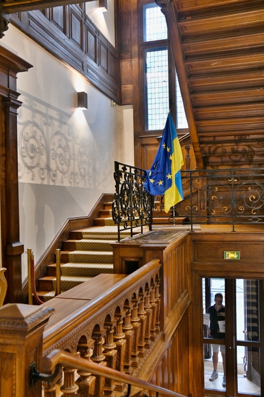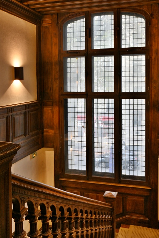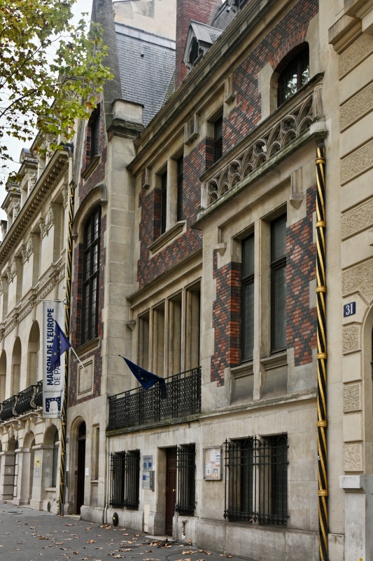 Z hlediska tohoto blogu nás ovšem bude zajímat především budova z 19. století, která jako by svojí architekturou z oka vypadla nedalekému sídlu Cité de l´économie, spadajícímu pod Banque de France. Stejný neorenesanční a neogotický styl, stejná fasáda, vyskládaná do nakoso položených čtverců z cihel červené a černé barvy s lemováním z bílého kamene a dokonce i stejný typ okapů, vytvářejících na fasádě zlato-černou kroucenou obrubu. Není divu, obě stavby navrhl stejný architekt – Jules Février, který je autorem ještě několika dalších domů v této oblasti Paříže.
