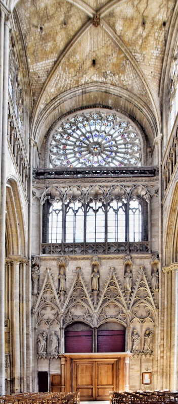 Vstupem do katedrály se návštěvník ocitá v majestátním prostoru s vysokými klenbami a velkolepými vitrážemi. Ty pocházejí z různých období, přičemž některé z nich jsou původní ze 13. století. Ve své většině zobrazují scény z Bible a život svatých, ale také některé události, spojené s historií Rouenu.