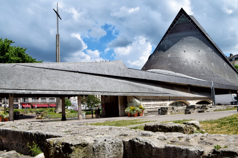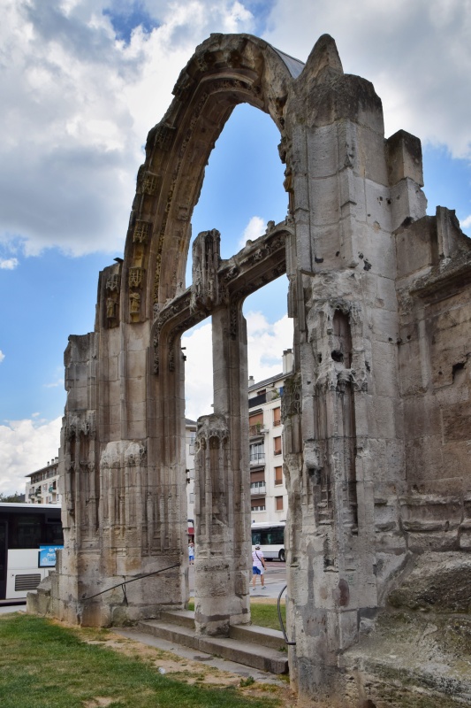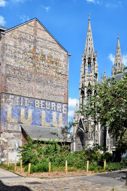 K druhému kostelu, do kterého vás dnes vezmu, se dostaneme spletí úzkých uliček, které nás přivedou na hlavní náměstí města – Place du Vieux-Marché. Právě zde byla v roce 1431 upálena Johanka z Arku. Na její památku tady byl v 15. století vybudován gotický chrám, zasvěcený svatému Vincentovi, s krásnými detaily typickými pro rouenskou sakrální architekturu a s vitrážemi, proslavenými jako nejkrásnější v celé Normandii. Kostel byl však zcela zničen v roce 1944 při spojeneckém bombardování Normandie. Některé vitráže se dochovaly a byly přesunuty do jiných chrámů, zatímco zbytky kostela Saint-Vincent, včetně některých architektonických fragmentů, jsou dnes rozmístěny po městě jako jeho připomínka.