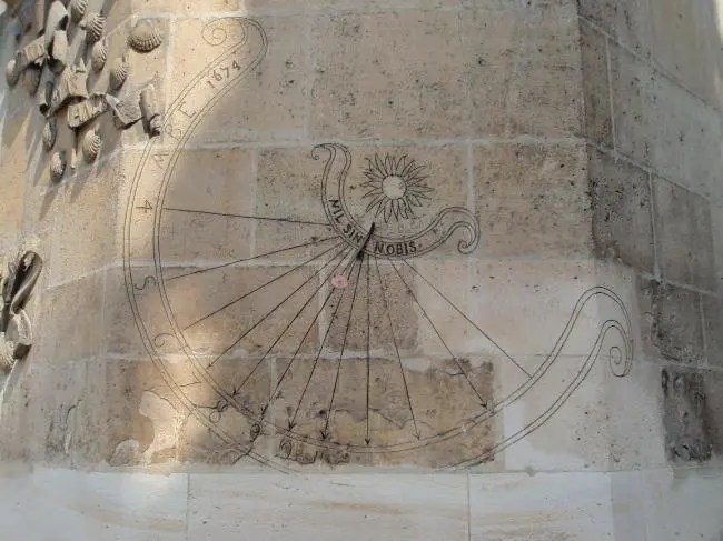 Jako maniak přes sluneční hodiny neodolám, abych nezdůraznila tento krásný exemplář z roku 1674, umístěný na zdi hned u bývalého hlavního vchodu