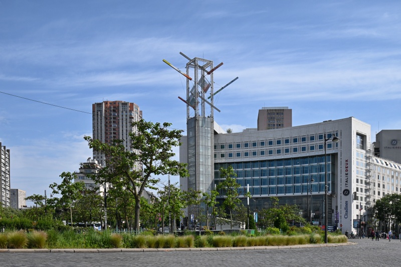 Na opačné straně náměstí se tyčí nákupní centrum Italie Deux, před kterým se vypíná do výšky zvláštní věž. Autorem jejího návrhu byl japonský architekt Kenzo Tange. Komu by se budova zdála příliš velká a nehodící se na toto místo, může být klidný, protože původní projekt ze 60. let minulého století zde počítal se stavbou mrakodrapu, který měl svojí výškou překonat Tour Montparnasse. Další mrakodrapy měly postupně vyrůstat podél boulevardu d´Italie směrem z centra. Plány byly zrušeny poté, co se v roce 1975 dostal k moci prezident Giscard d´Estaing, který mrakodrapy v centru města odmítal.