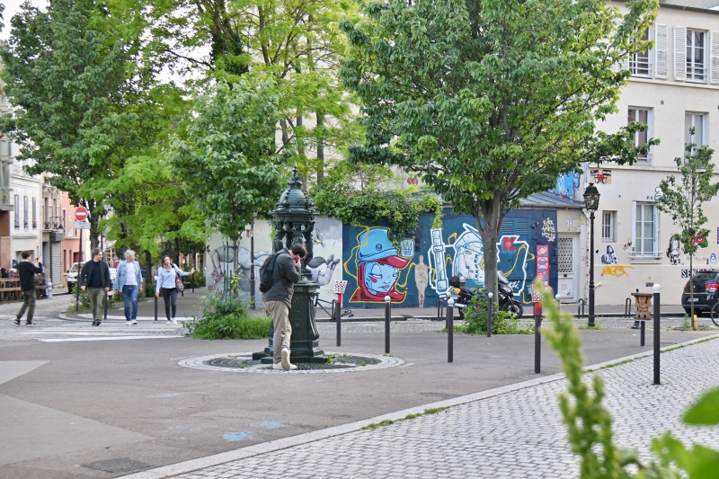 Jen o něco níž leží place de la Comune de Paris s těmi možná nejhezčími nástěnnými malbami a s fontánou s pitnou vodou uprostřed