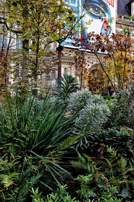 Stávající fontány před radnicí byly zachovány v původní podobě a integrovány do nového designu. Vzhledem k tomu, že pod plochou vede podchod metra a nacházejí se tam také podzemní garáže, nemohly být všechny rostliny sázeny přímo do země. Nicméně i přes složité podloží byla aspoň jedna jejich část, hlavně padesátka odolných stromů jako duby, habry a akáty, vysazena volně, zatímco jiné rostliny zůstaly v kontejnerech nebo květinářích, zakamuflovaných zvýšenou plochou záhonů.
