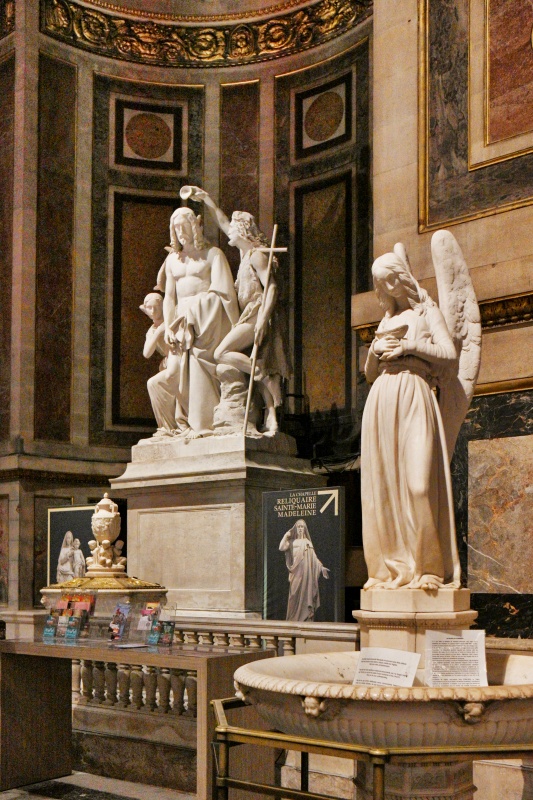 Za sochou anděla (jednoho z mnoha, které v kostele najdete), stojí sousoší s názvem Jan Křtitel křtí Krista od Françoise Rudeho.