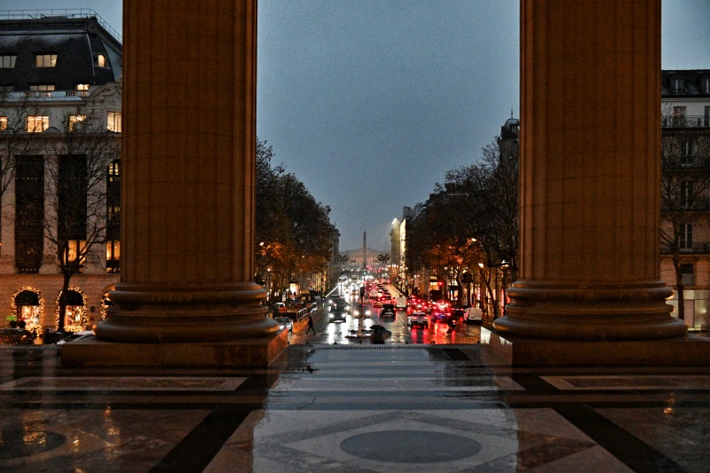 Pohled z monumentálního schodiště kostela přes rue Royale, place de la Concorde a pont de la Concorde až na Bourbonský palác v pozadí, který je sídlem Národního shromáždění. Palác zakončuje osu stejným průčelím, jako má Madeleine. O tom, že bude palác směrem k Seině vybaven stejným trojúhelníkovým frontonem a dvanácti sloupy, rozhodl v roce 1806 Napoleon, aby vytvořil efekt symetrie s Madeleine. Průčelí paláce bylo dokončeno v roce 1810, zatímco samotný kostel byl ještě ve výstavbě.