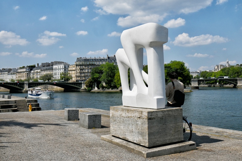 V popředí pont de la Tournelle, který překračuje rameno Seiny z nábřeží na ostrov Saint-Louis, se sochou svaté Geneviève, kterou vytvořil sochař Paul Landowski. Podoba této plastiky připomíná jeho nejznámější dílo, Krista Vykupitele, který se tyčí nad Rio de Janeirem. Za mostem vidíme katedrálu Notre-Dame na Ile de la Cité. Všechny stavby po pravé straně jsou součástí čtvrti Marais. Úplně vlevo v pozadí vidíme obrysy La Défense.