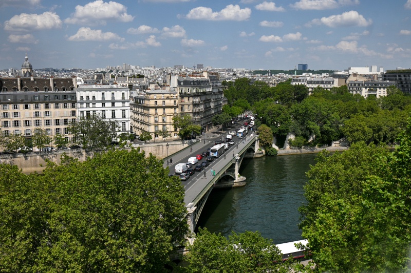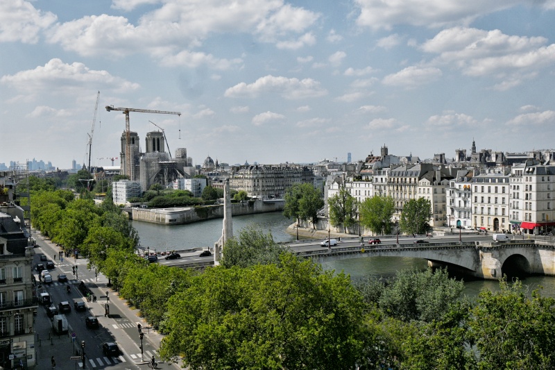 Ze střechy je neobvyklý výhled nejen na řeku s mosty pont de Sully a pont de la Tournelle, ale i na výseč města od place de la Bastille úplně vpravo až po nábřeží quai de Montebello úplně vlevo a s katedrálou Notre-Dame uprostřed.