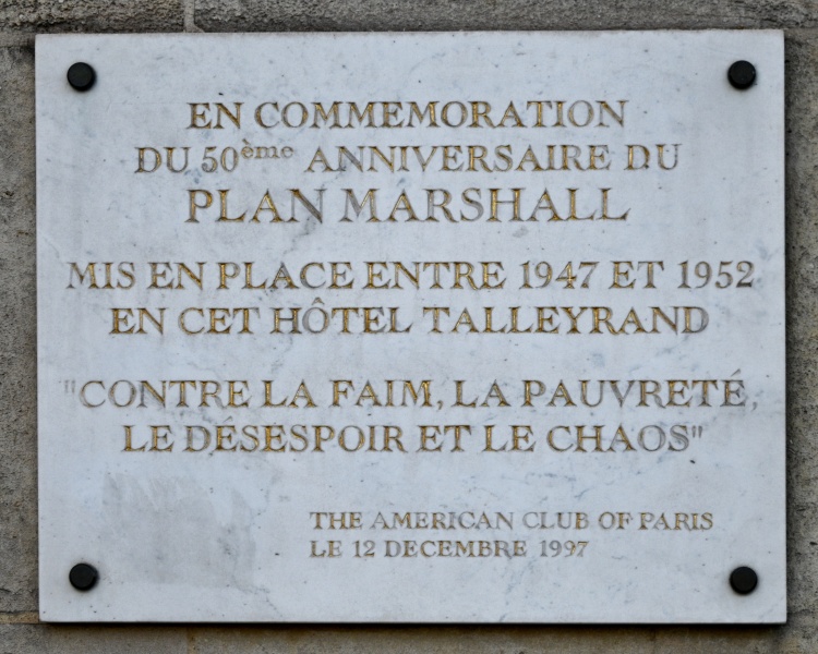 Historii Marshallova plánu a současnou činnost centra připomíná nejen výstavka v jídelně, která byla místem zasedání, a fotografie a různé informační panely, rozmístěné v ostatních salonech, ale především pamětní deska, respektive dvě desky, jedna ve francouzštině a jedna v angličtině, umístěné na budově ze strany rue de Rivoli.