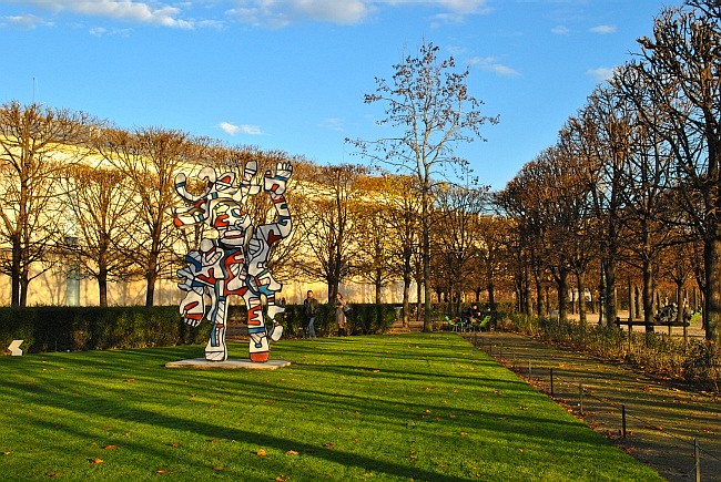Na trávníku vedle Míčovny stojí jedno z mnoha uměleckých děl, které jsou po zahradě rozestavěny. Na rozdíl od většiny ostatních vás toto dílo ve své barevnosti přitáhne už z dálky. Autorem je Jean Dubuffet (1901 – 1985) a socha, vytvořená v roce 1973, představuje Krasavce v kostýmu (Le Bel costumé, nevím jak to přeložit líp). Měří čtyři metry a je vytvořený z epoxydové pryskyřice.