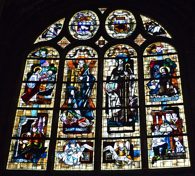 Samozřejmě nesmíme zapomenout ani na vitráže, protože těch je v kostele taky nepřeberně. Většinou pocházejí z poloviny 19. století, jen devět oken v chóru vysoko nad oltářem je původních z roku 1631.
