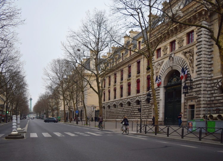 Pohled na část uliční fasády kasáren. V dálce je vidět Červencový sloup na place de la Bastille.