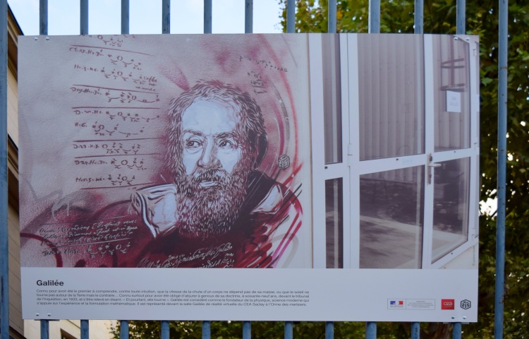Stejně jako v Saclay u hlavního vchodu, tak i na plotě v rue Descartes v 5. obvodu začíná historie vědy u Galilea