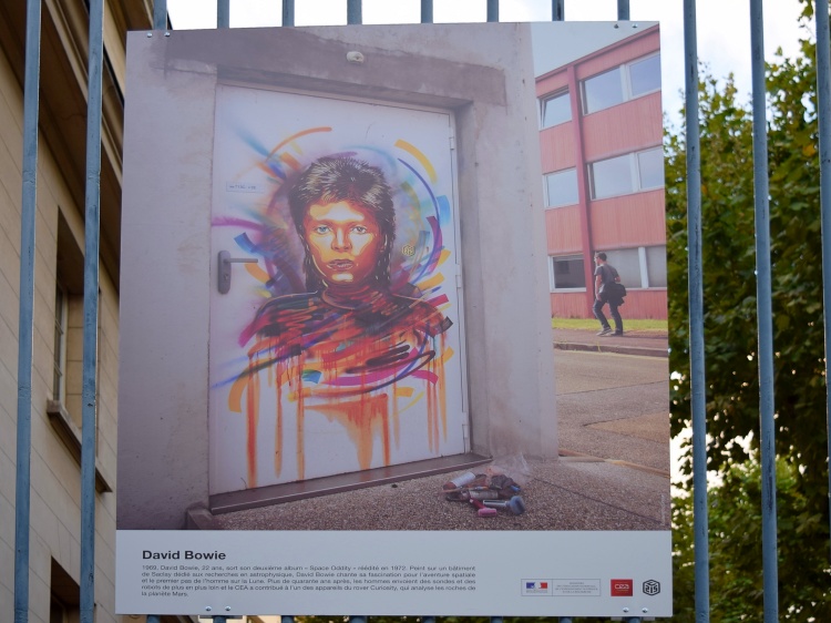 Fotek ze Saclay se zobrazením francouzských i jiných světových vědců na plotě viselo mnohem víc. Našla jsem mezi nimi i Davida Bowieho, který si toto čestné místo zasloužil údajně svým obdivem k astrofyzice, který vyjádřil na svém albu Space Oddity.