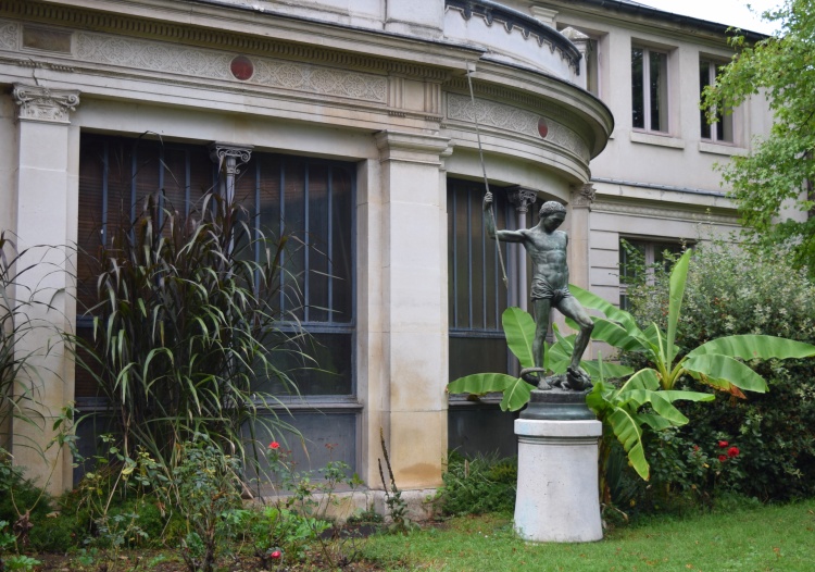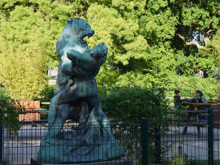 Zahrada je doslova posetá sochami, které většinou pocházejí z konce 19. století. Tato nahoře se jmenuje Lovec medvíďat (z dálky to moc není vidět, ale ten lovec, kterého právě dostihla matka medvědice, která se přišla pomstít, má u pasu přivázaného malého mrtvého medvídka).