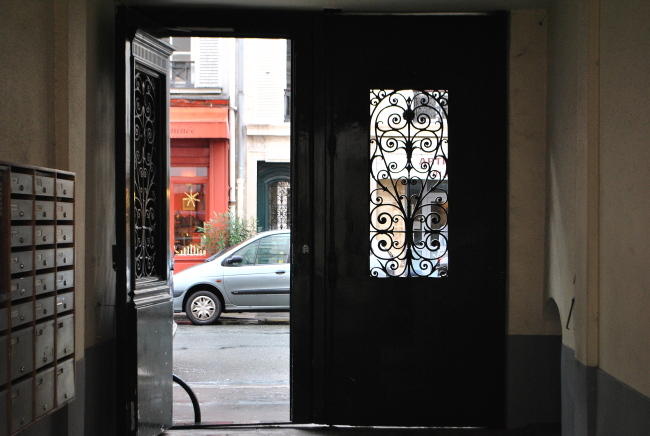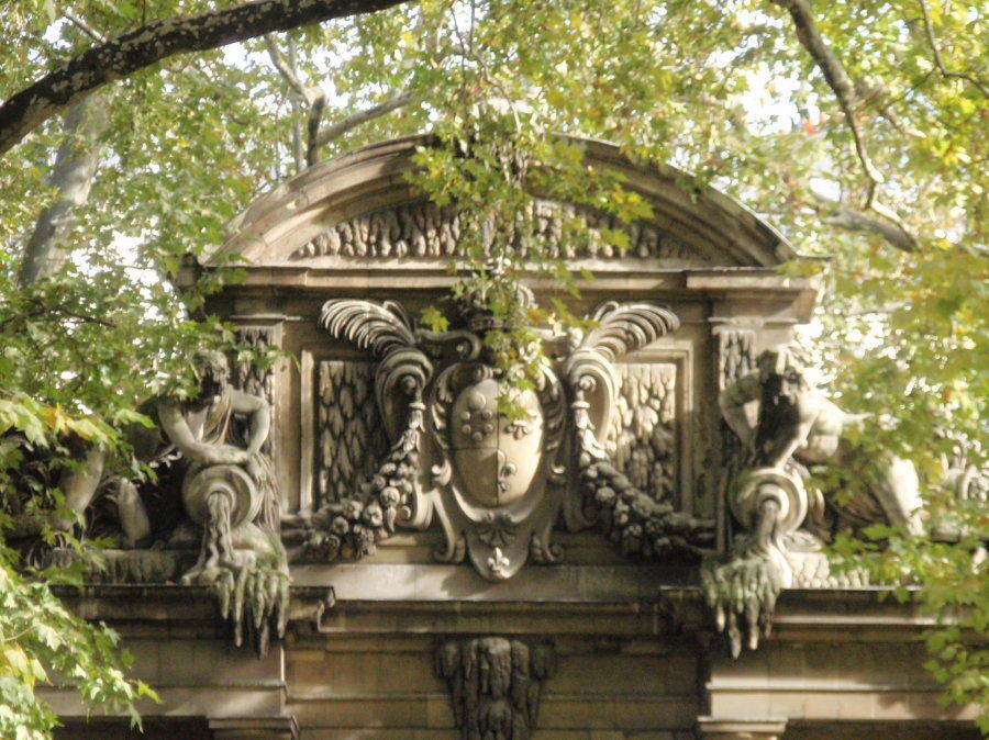 Štít s erby francouzských králů (lilie) a rodu Medicejských, nad ním královská koruna, po straně alegorie Rhôny a Seiny