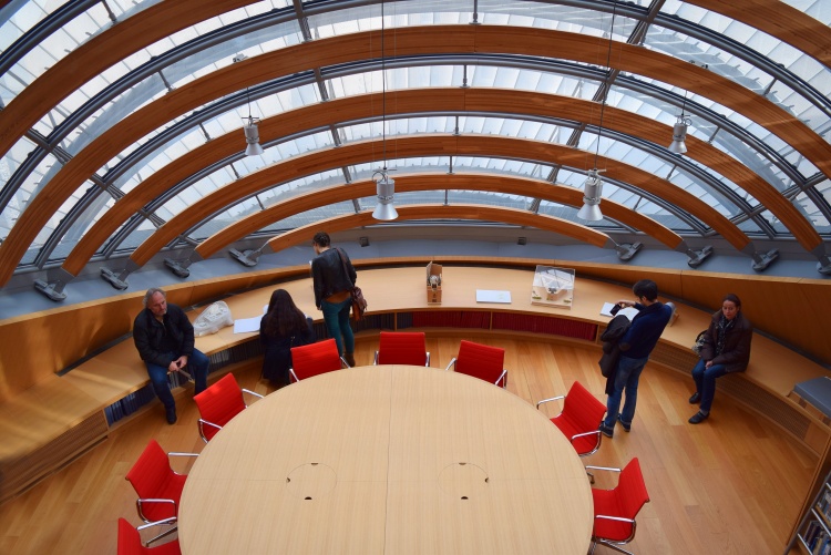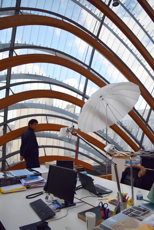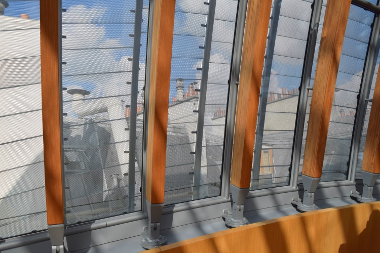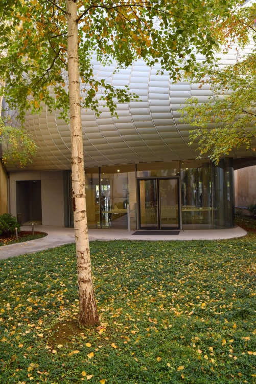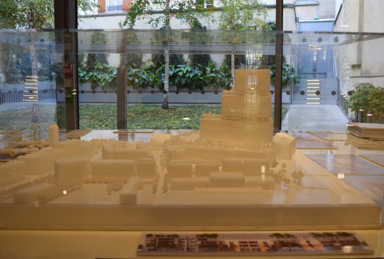 Nahoře je vidět vstupní hala s výhledem do malé zadní zahrady. V hale je vystaven model nového Justičního paláce, který se právě začíná stavět v 17. obvodu a který je také dílem architekta Renza Piana.