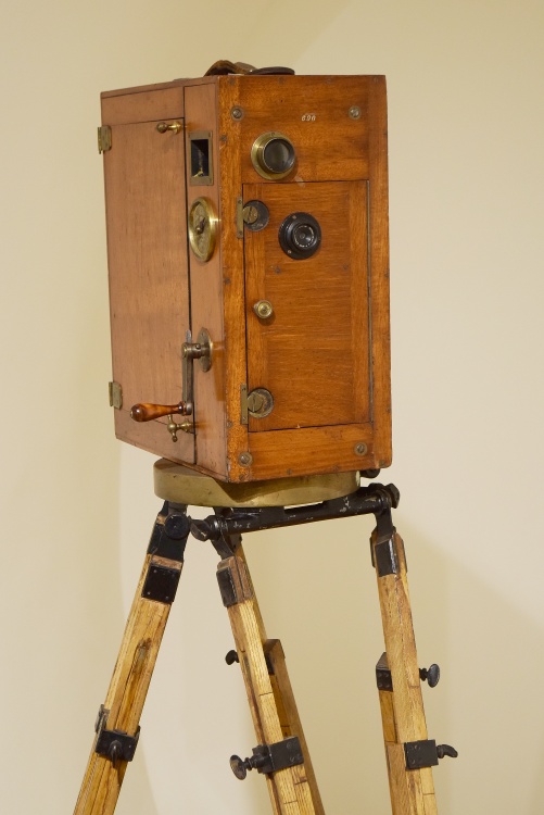 Nejstarší filmová kamera, ještě s klikou, společnosti Pathé z roku 1896