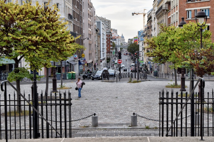 Fotografie z kostelních dveří pro zorientování. Před námi place Jeanne d´Arc a dlouhá rue Jeanne d´Arc. Osa probíhá rovnoběžně se Seinou velkou částí 13. a 5. obvodu a vzadu končí Panthéonem.