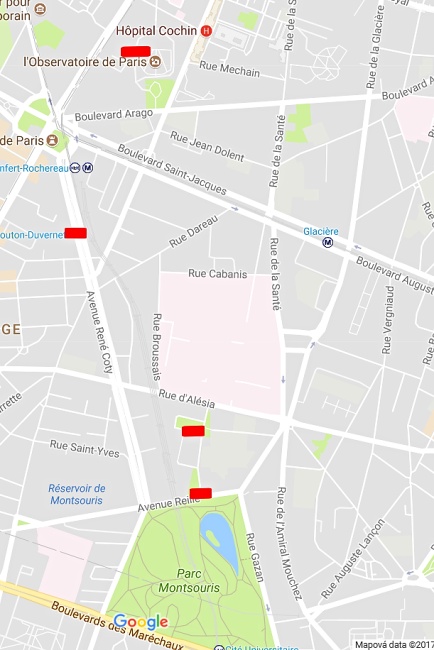 Mapa ukazuje celé okolí, ve kterém jsme chodili, počínaje rue Daguerre vlevo pod place Denfert-Rochereau, dále kolem hřbitova Montparnasse a potom stále po směru hodinových ručiček.