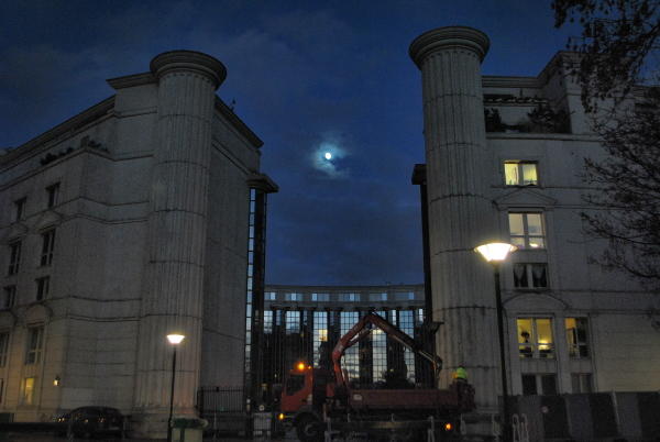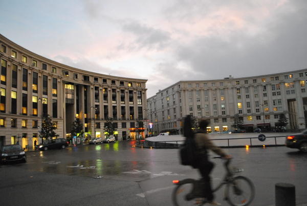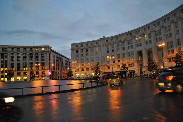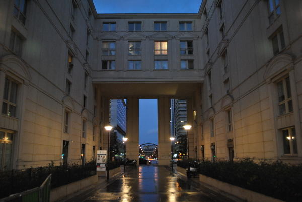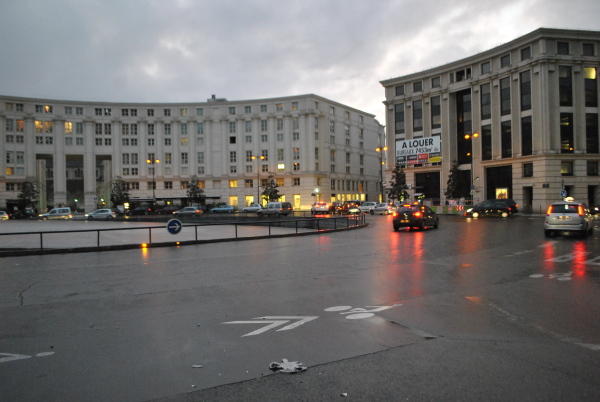 Východ z náměstí směrem k Rue Vercingetorix je zakončen dvěma dórskými sloupy. Bohužel ten autojeřáb mezi nimi stál tak dlouho, že už jsem nemohla s focením déle čekat, bála jsem se, že kvůli soumraku by toho o pár minut později už nebylo moc vidět.