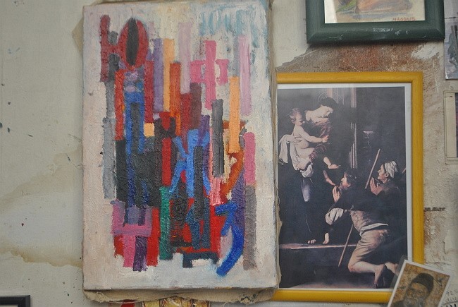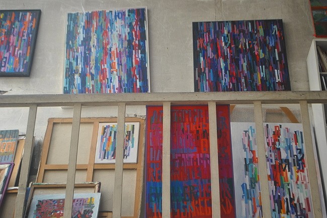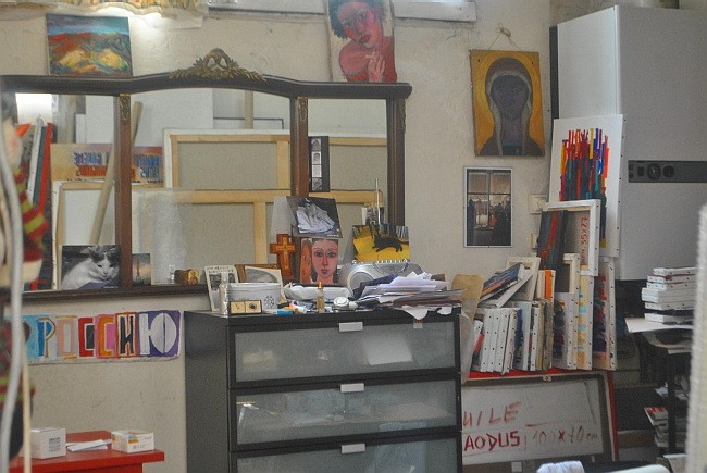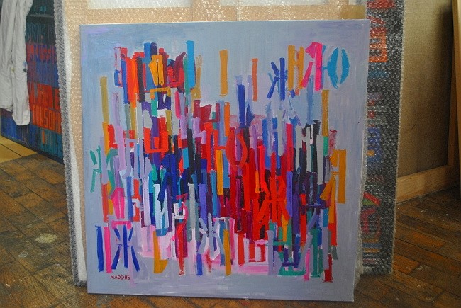 Dnes v Soutinově ateléru maluje ruská malířka, narozená v Chorvatsku, paníMira (Mirjana) Maodusa já jsem měla příležitost se do ateliéru letos v létě podívat. Paní Mira je krásná, vypadá o dvacet let mladší, ale fotografovat se nechtěla (můžete ji ale vidětTADY). Dovolila mi však vyfotit jak ateliér, tak i její obrazy. Maluje především abstraktní díla, tvořená z barevných písmen v azbuce, nebo čísel, ale také figury a krajiny.